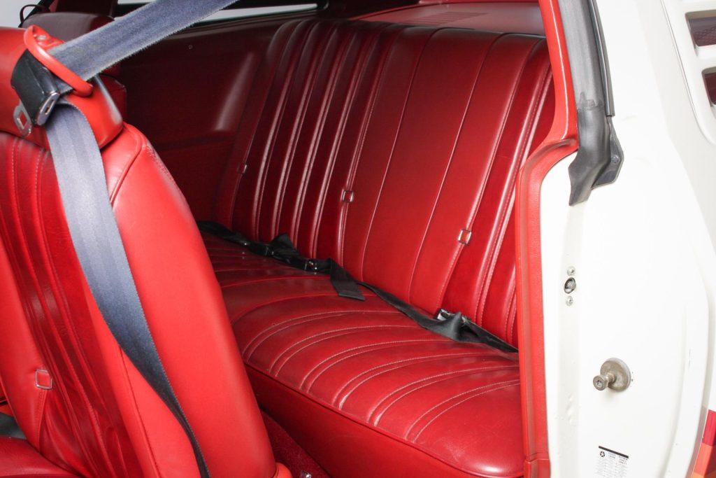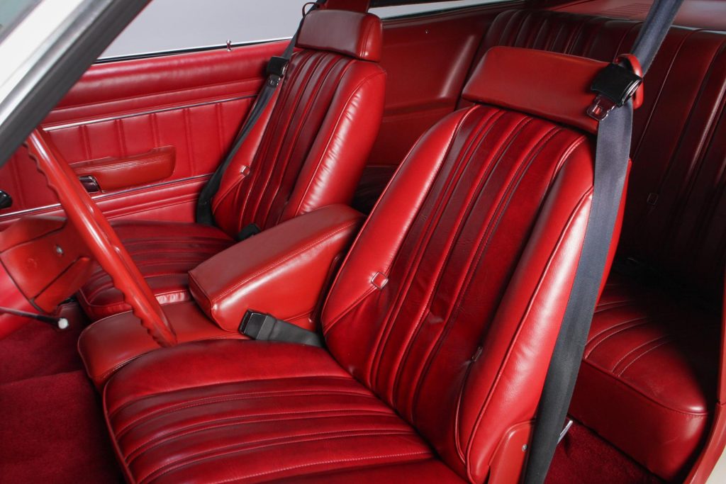 • Red vinyl bucket seats restored with NOS materials